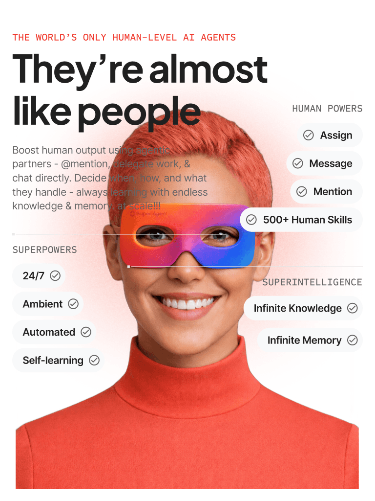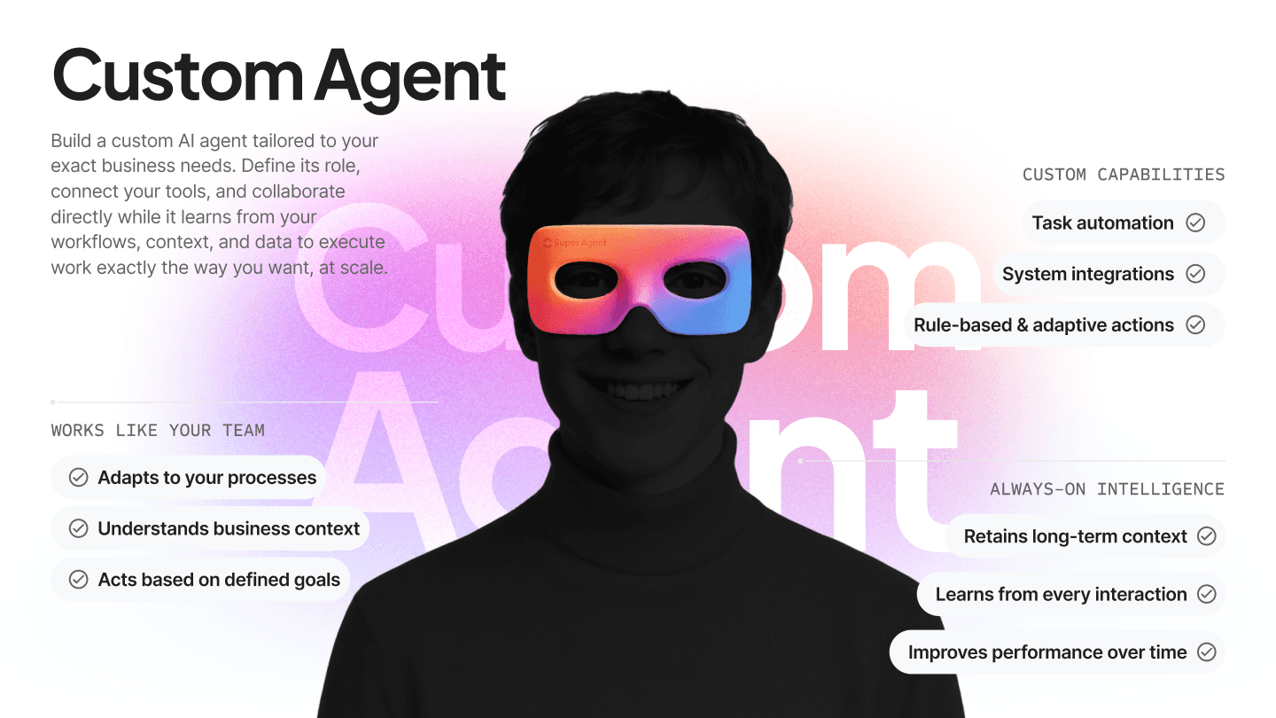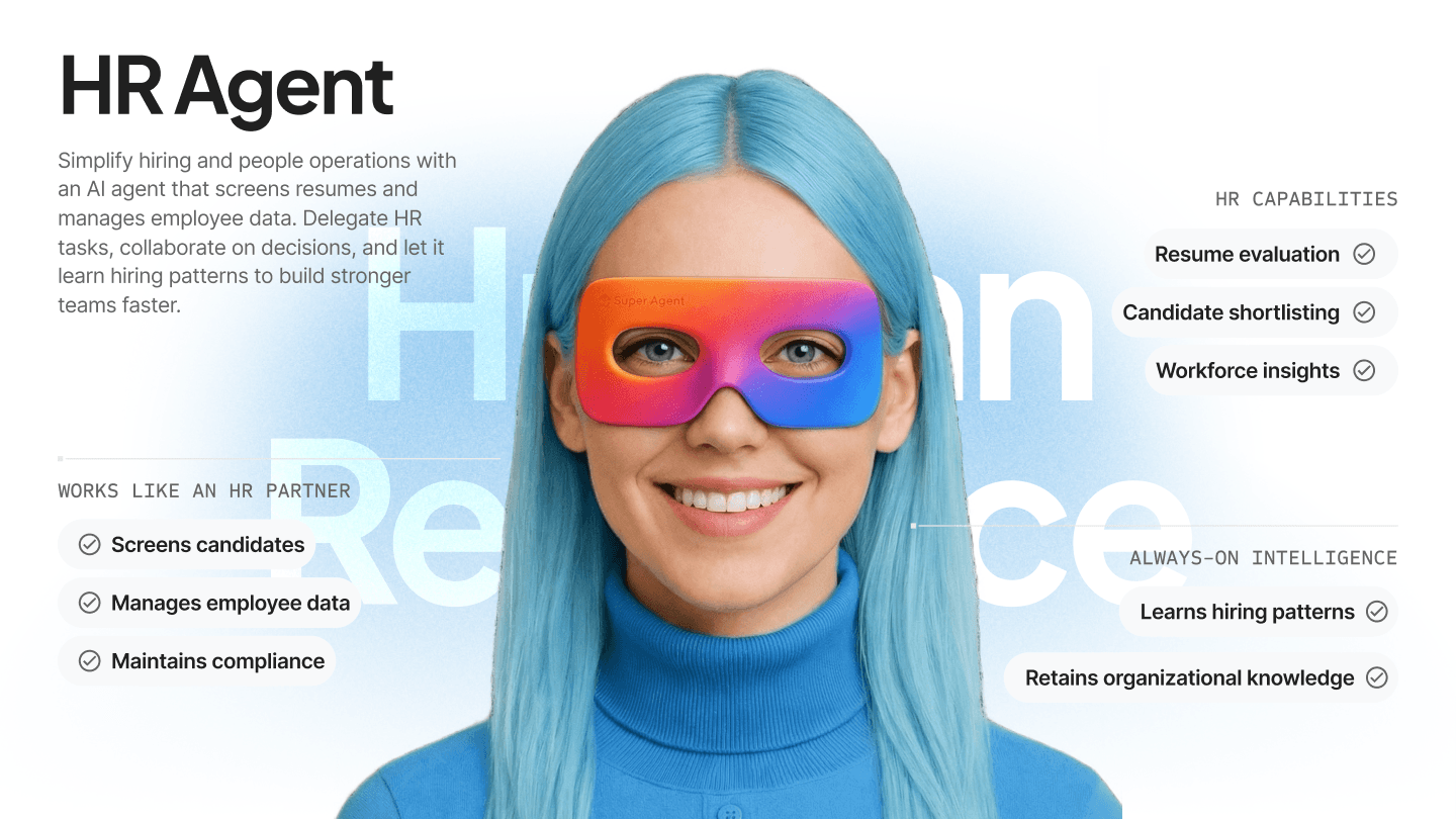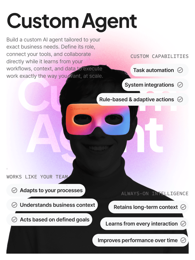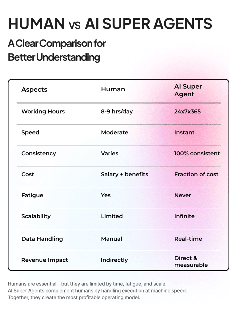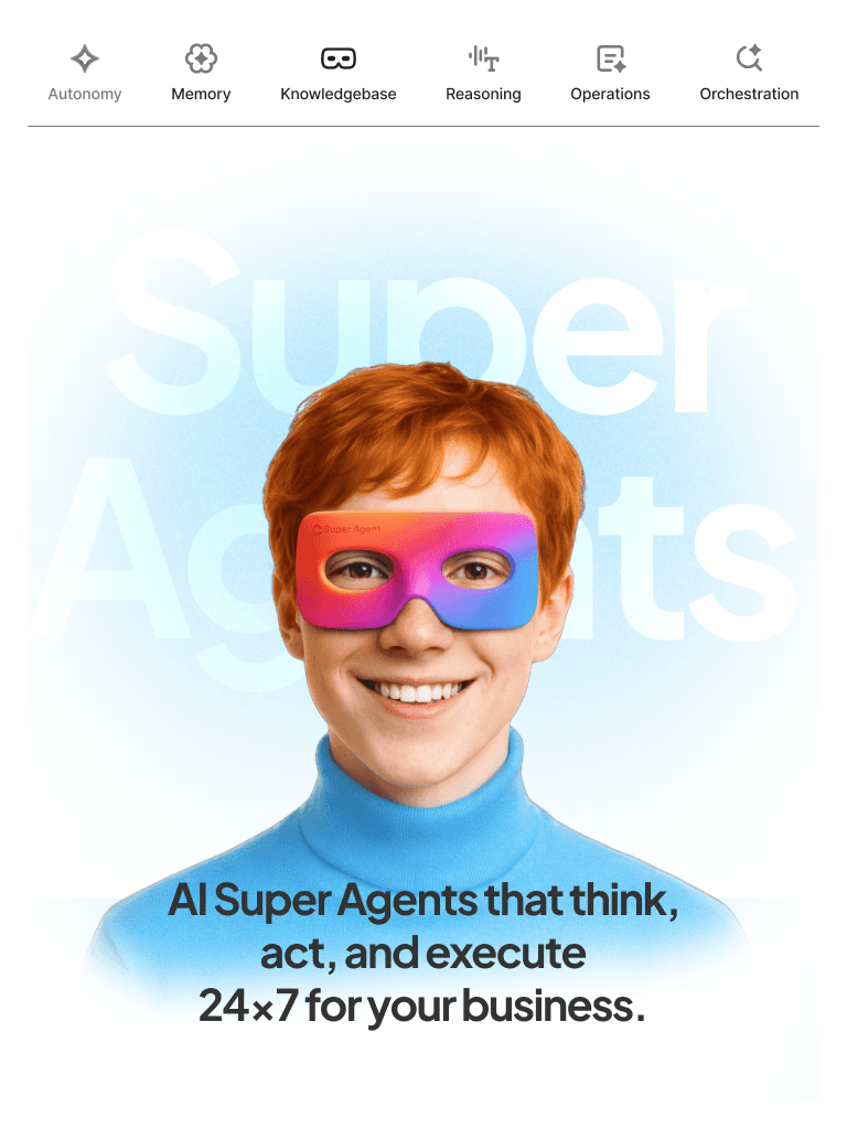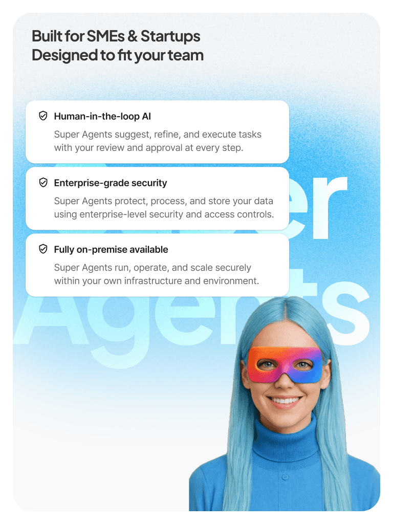 AI Super Agents are autonomous AI workers trained on your business context. They handle sales follow-ups, customer support, marketing tasks, operations monitoring, HR processes, and reporting—while escalating to humans whenever approval is required.